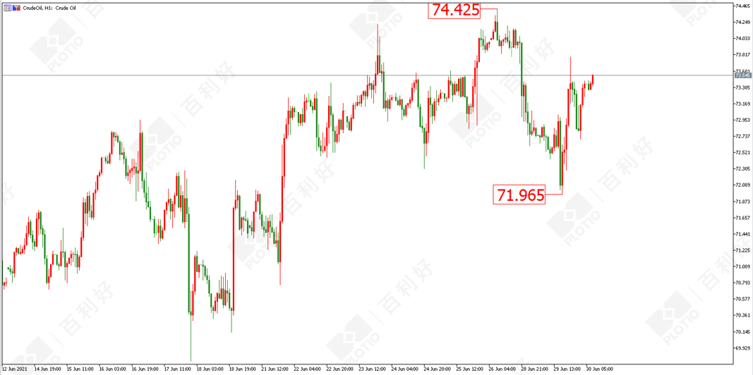 原油方面:油價昨日(6月29日)走勢偏向震盪,最低觸及71.96美元的位置,隨後快速拉起,多頭仍未改變。