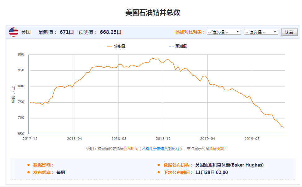 根據美國能源情報署(EIA)在11月18日的月度預測中,美國7個主要頁岩油產區預計將在12月份增加產油量約4.9萬桶/日,從而達到創紀錄的913萬桶/日。此外,美國貝克休斯原油鑽井數量跌至671口,也是從2018年底以來的持續性下跌新低位,代表美國頁岩油技術的成熟也表明開采成本的下降。